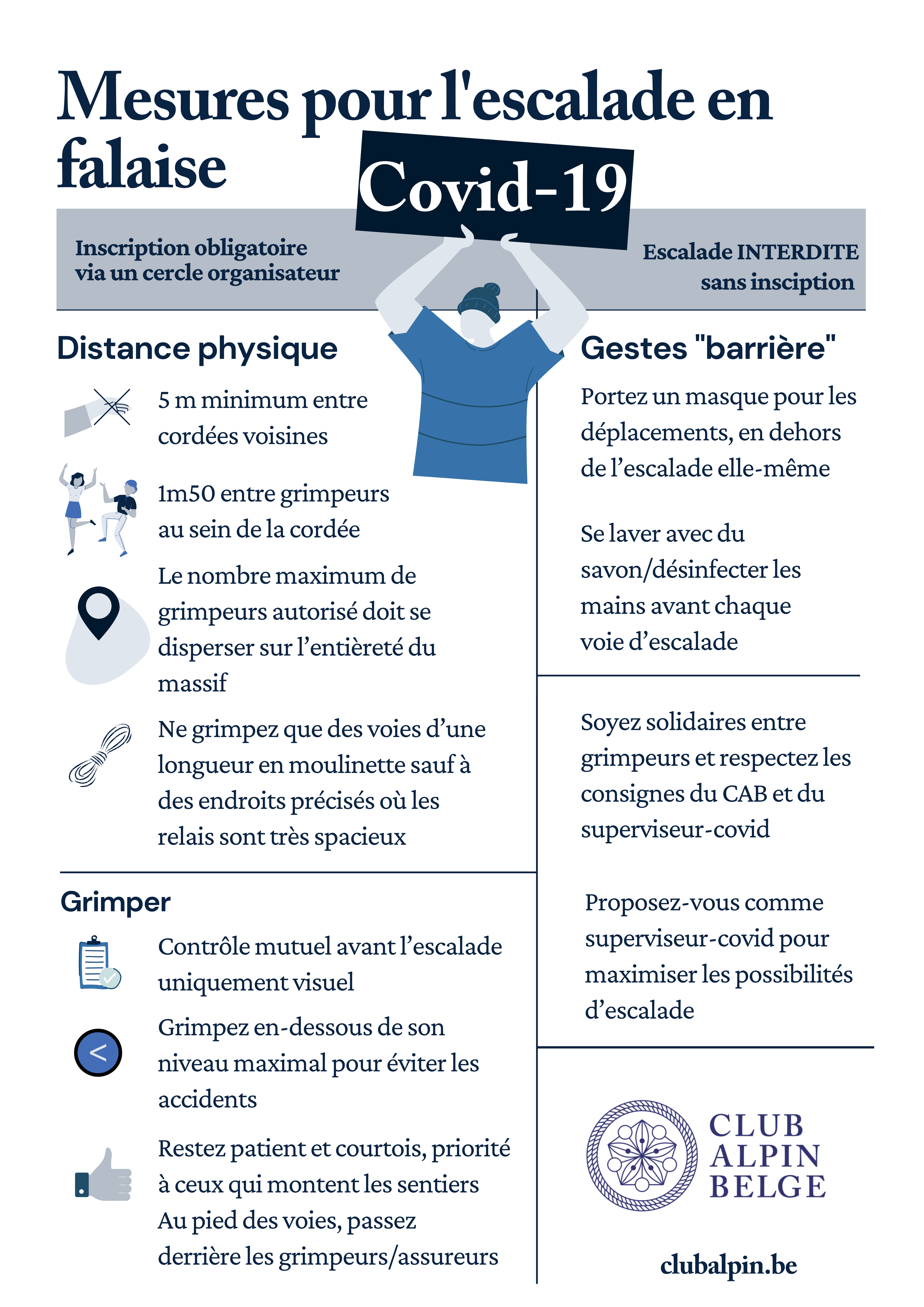 1. Un « groupe » de maximum 20 personnes sous la supervision d’un « superviseur –Covid » peut s'organiser dans le cadre des activités d’escalade réservées via un cercle/ club. AUCUN grimpeur individuel n’est autorisé. Il faut être membre du CAB en règle de cotisation (ou éventuellement UBS/KBF) pour participer.
