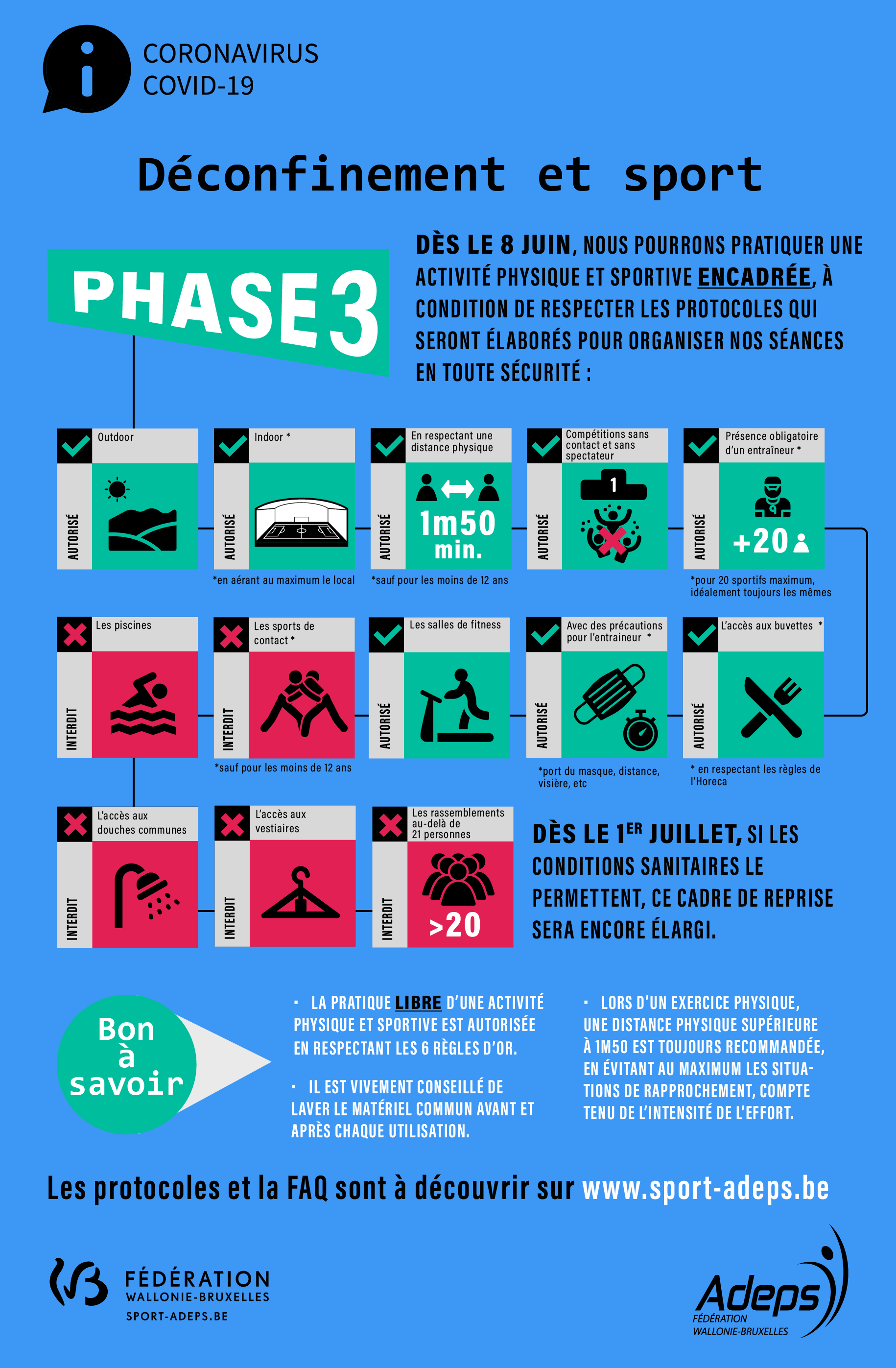 Dans le cadre du déconfinement - phase 3, la pratique du sport outdoor dès ce lundi 8 juin, doit respecter les mesures suivantes imposées par les autorités: